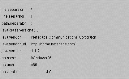 Applets can read some, but not all, system properties. This page lists the system properties that Netscape Navigator 2.0 and the Applet Viewer allow applets to read, followed by a list of properties that applets can't read.