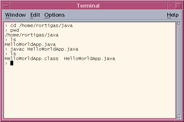 pwdat the prompt, you should see/home/rortigas/java. If you enterlsat the prompt, you should see your.javaand.classfiles. Now enterjava HelloWorldAppagain.If you still have problems, you might have to change your CLASSPATH variable. To see if this is necessary, try "unsetting" the classpath with the following command: