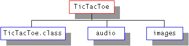 Let's look at an example. The JDKTM demos include a simple TicTacToe applet. This demo contains a bytecode class file, audio files, and images all housed in a directory called TicTacToe having this structure:The audio and images subdirectories contain sound files and GIF images used by the applet. To package this demo into a single JAR file named TicTacToe.jar, you would run this command from inside the TicTacToe directory: