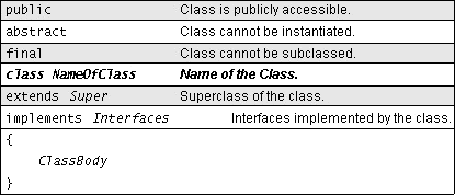The left side of the following diagram shows the possible components of a class declaration in the order they should or must appear in your class declaration. The right side describes their purposes. The required components are the class keyword and the class name and are shown in bold. All the other components are optional, and each appears on a line by itself (thus "extends Super" is a single component). Italics indicates an identifier such as the name of a class or interface. If you do not explicitly declare the optional items, the Java compiler assumes certain defaults: a nonpublic, nonabstract, nonfinal subclass of Object that implements no interfaces.The following list provides a few more details about each class declaration component. It also provides references to sections later in this trail that talk about what each component means, how to use each, and how it affects your class, other classes, and your Java program.