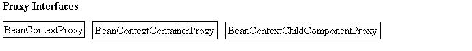 The classes and interfaces relevant to theBeanContextAPI are listed in the following diagrams. As you study the diagrams, take note of theBeanContextandBeanContextServicesinterfaces, and that each has its own concrete implementation that you can subclass or instantiate directly (classesjava.beans.beancontext.BeanContextSupportand