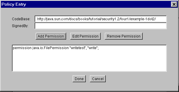 Click the image to view it at its natural size.You are now done specifying this policy entry, so choose the Done button in the Policy Entry dialog. The Policy Tool window now contains a line representing the policy entry, showing the CodeBase value.